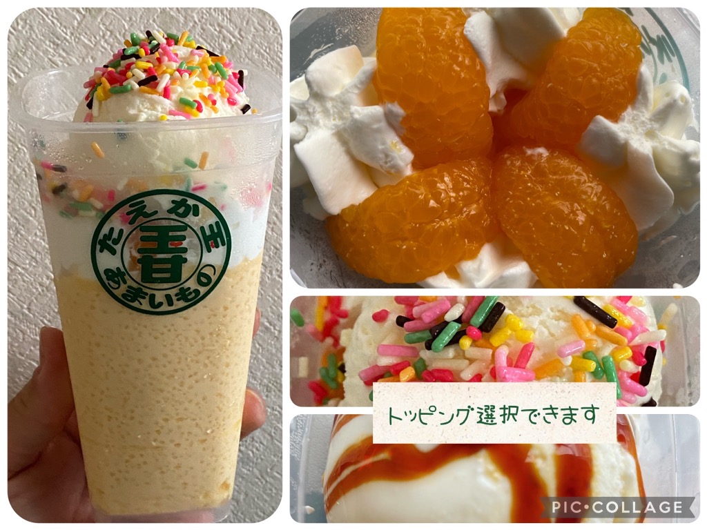 昔から親しまれているカスタードプリンの上に、生クリームとみかん缶、バニラアイスをのせカラメルソースかカラフルスプレーをトッピングいたします